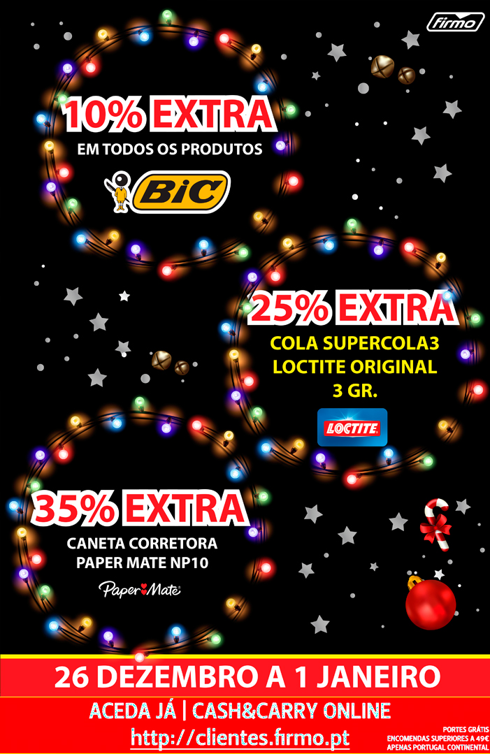 SUPER DESCONTOS! | 10, 25 e 35% DESCONTO EXTRA EM TODOS OS PRODUTOS BIC, SUPERCOLA 3GR E PAPERMATE NP10! | 26 A 1 DE JANEIRO | CASH&CARRY ONLINE FIRMO