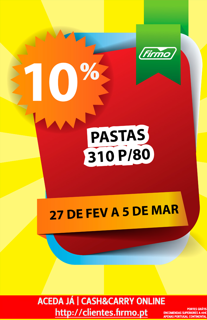 SUPER DESCONTOS! | 10% DESCONTO EXTRA EM PASTAS 310 P/80! | 27 A 5 DE MARÇO | CASH&CARRY ONLINE FIRMO