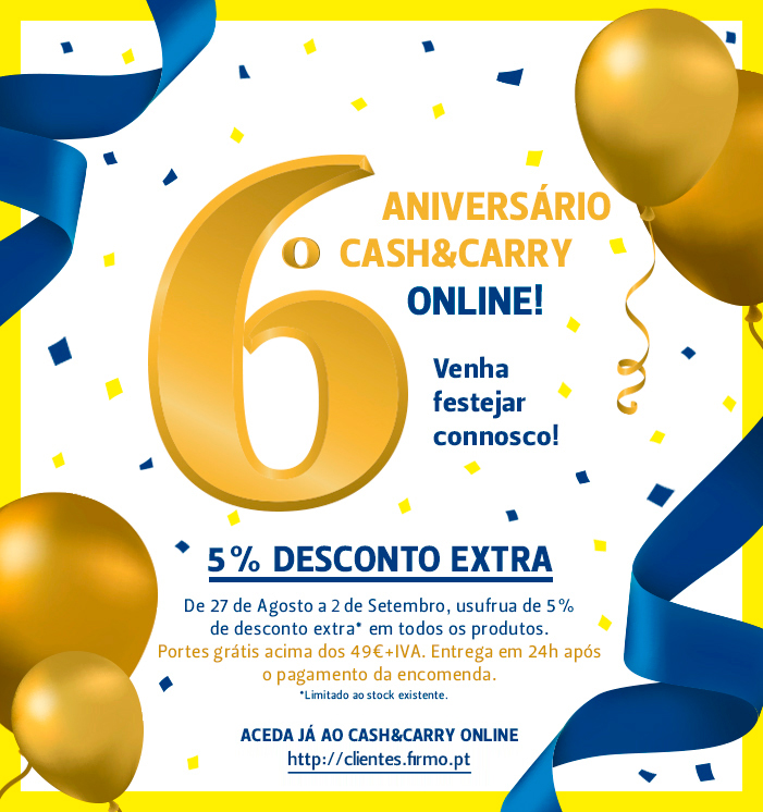 6º Aniversário Cash&Carry Online – 5% DESCONTO EXTRA – Venha Festejar Connosco! – Aceda já! | FIRMO