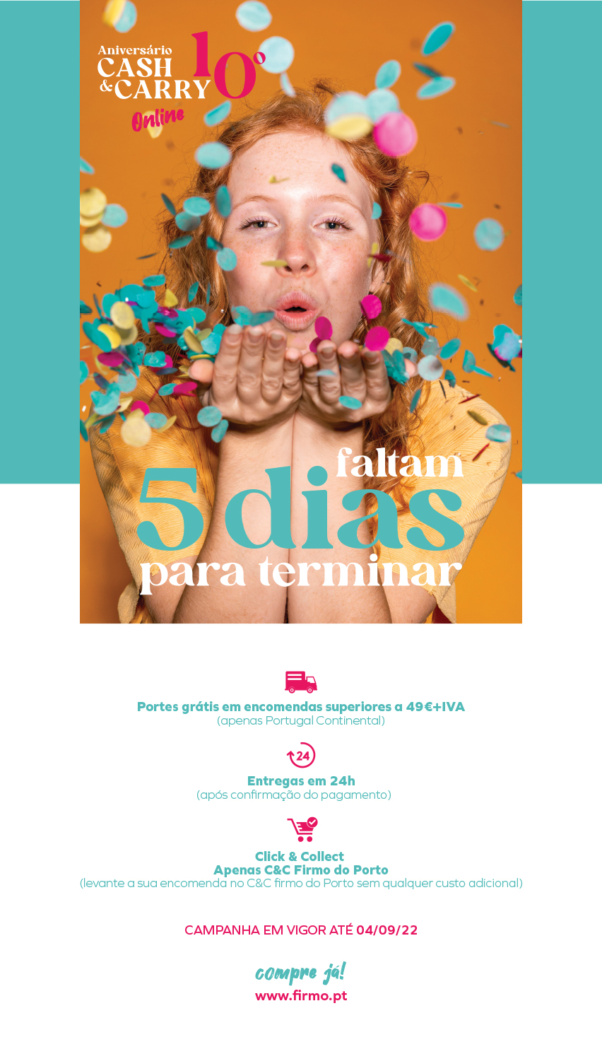 5% DESCONTO EXTRA em TODAS as encomendas | Faltam 5 dias para terminar o Aniversário do Cash&Carry Online | Compre já em FIRMO.pt