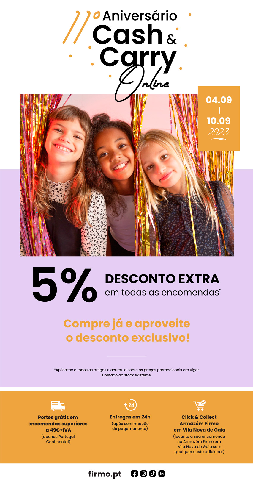 11º Aniversário Cash&Carry Online | 5% DESCONTO EXTRA em todas as encomendas | Compre já em FIRMO.pt