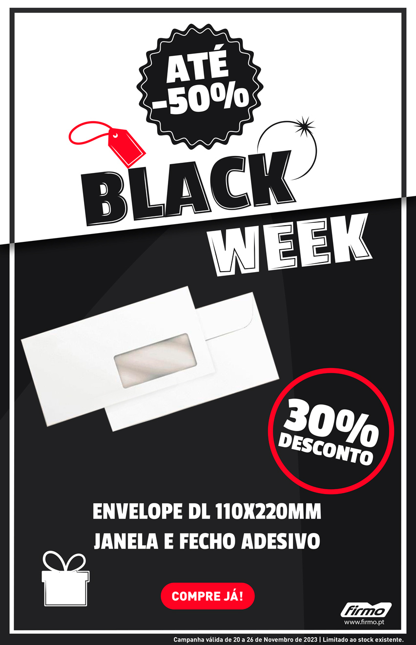 Black Week FIRMO | Aproveite já, os 30% de DESCONTO no Envelope DL 110x220MM com janela e adesivo | Compre já em FIRMO.pt