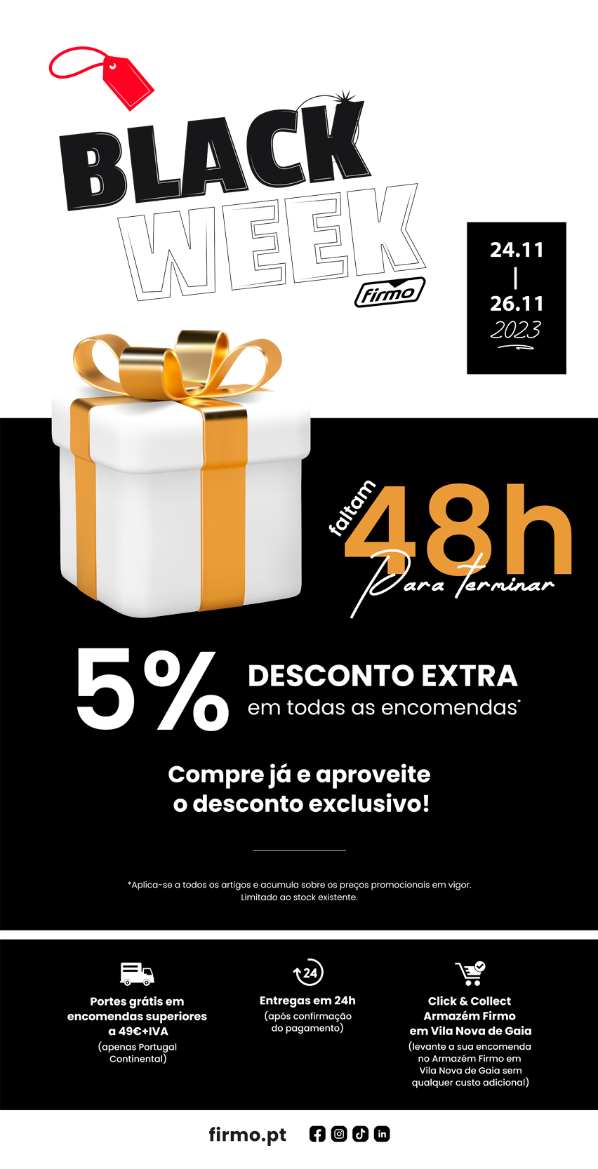 Últimas 48 HORAS para usufruir dos 5% DESCONTO EXTRA em TODAS as encomendas | Black Week FIRMO | Compre já em FIRMO.pt