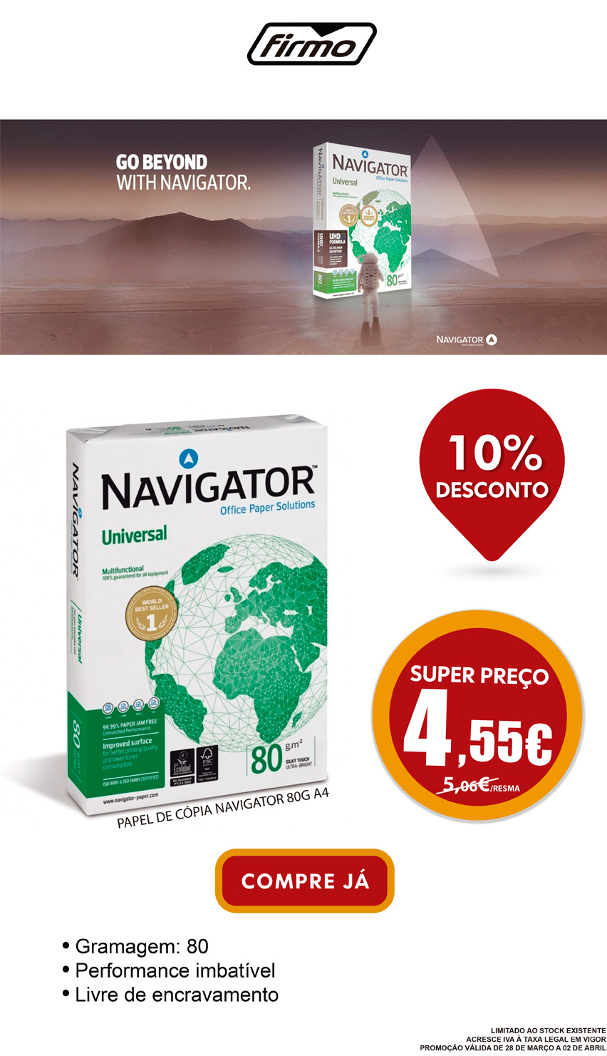 Últimas 72H | SUPER PREÇO | 10% DESCONTO em Papel de Cópia Navigator 80G A4 | Compre Online em FIRMO.pt