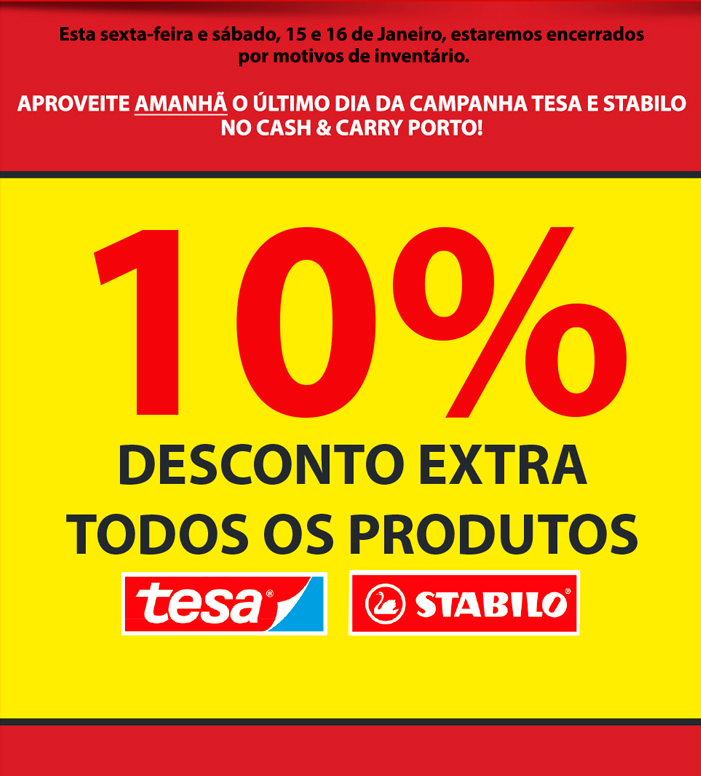AMANHÃ | ÚLTIMO DIA | DESCONTO EXTRA 10% EM TESA E STABILO | CASH&CARRY PORTO